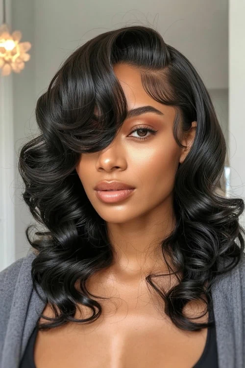 This is one of the most flattering Fall hairstyles, especially with chunky knit sweaters & cardigans. The softness of the waves complements textured knits, especially oversized or turtleneck sweaters. At the same time, the deep side part creates soft, face-framing volume.
