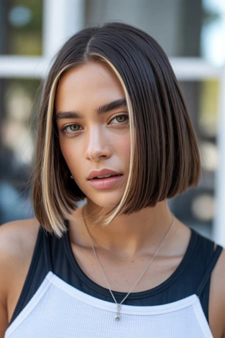A clean, one-length bob cut straight across for a bold, minimalist finish. This look doesn’t just make a statement—it drops the mic.