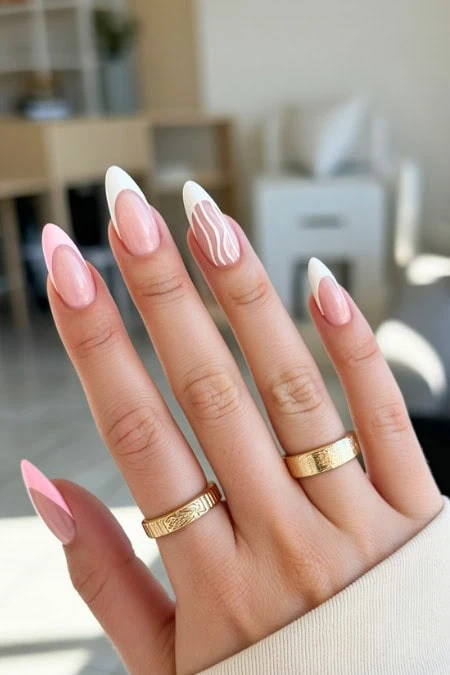 A soft pink almond manicure mixed with classic white French tips, a pink French, and a wavy white accent nail for a playful, feminine twist.